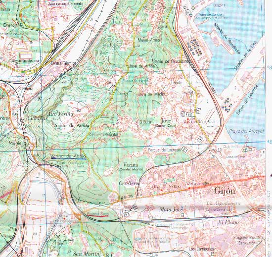 Se adjuntan dos planos topográficos, escaneados de la Hoja 14-III Gijón Oeste del MTNE a escala 1:25.000. La escala gráfica es el lado de cada cuadrado que tiene una longitud de 1.000 metros.