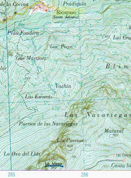 Trazado de la ruta Puerto La Cubilla-La Mesa, la cumbre queda en el mapa que sigue y la escala gráfica es de 1.000 m por cada lado de las cuadrículas.
